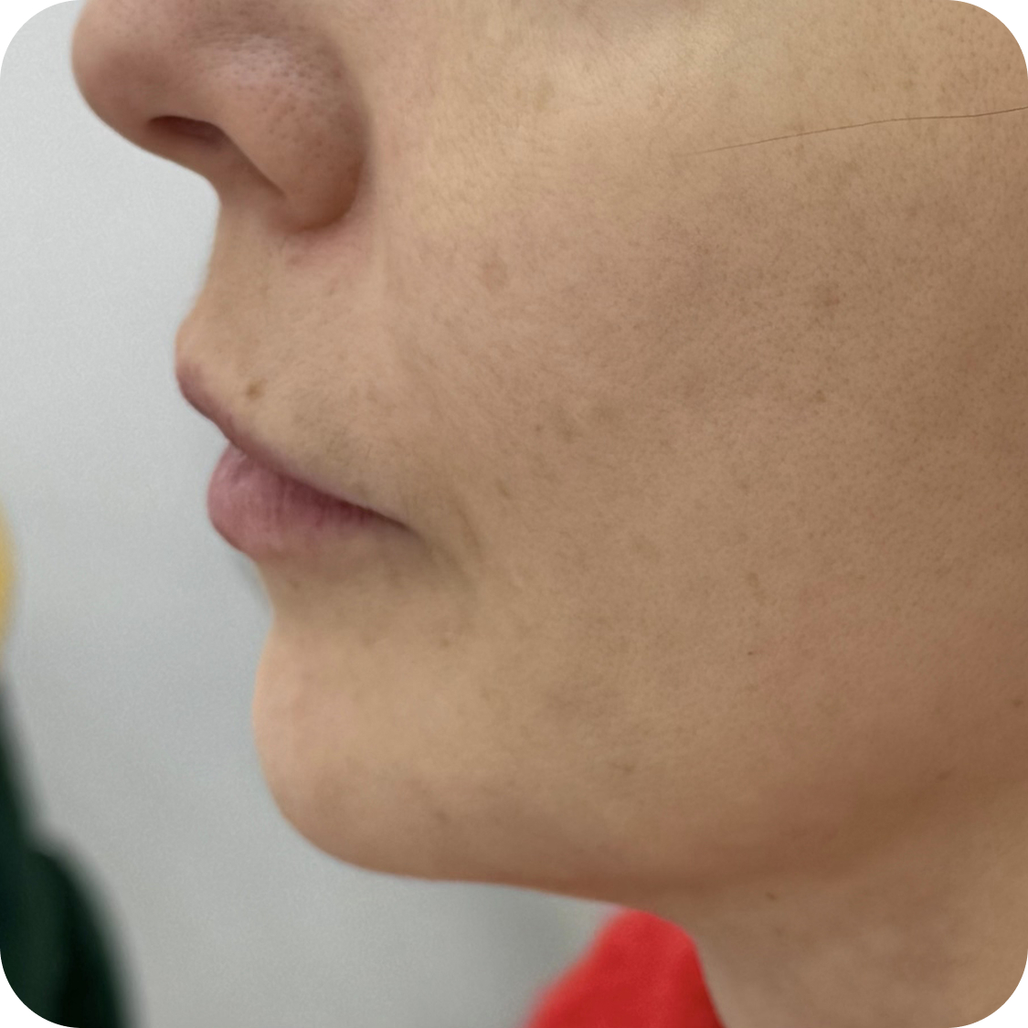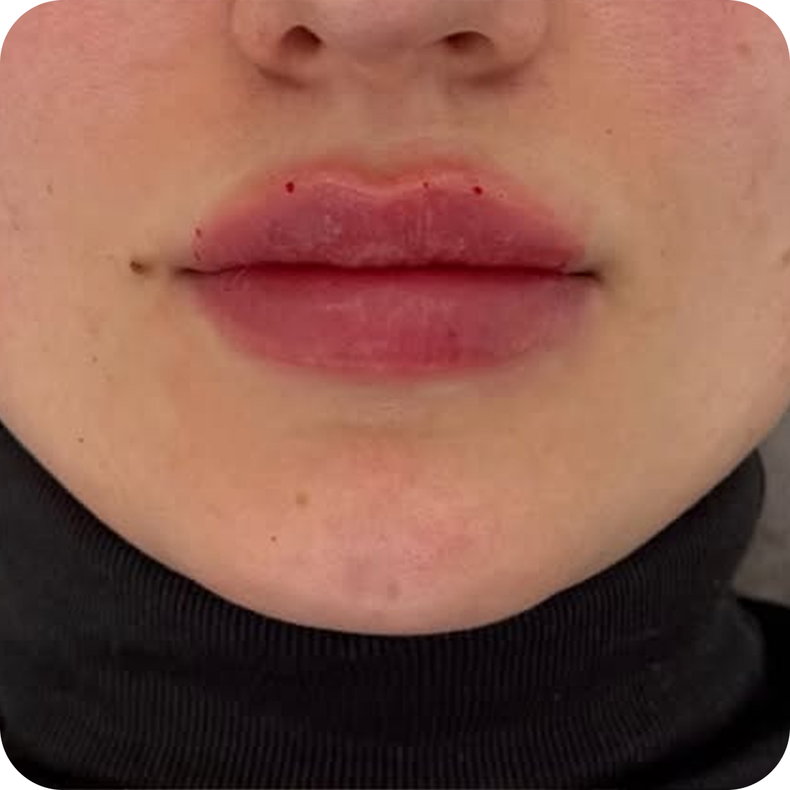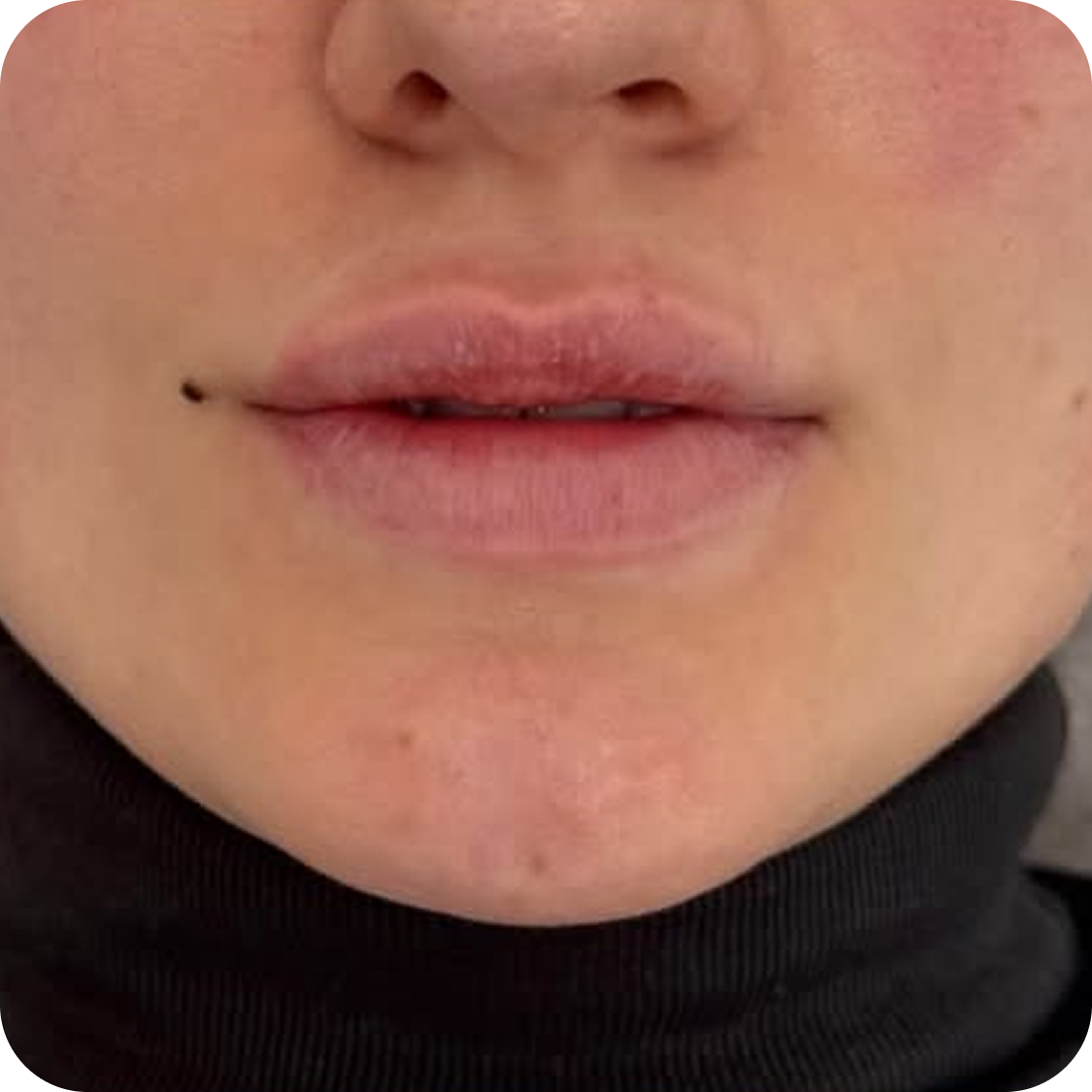 Поверхность губ выровнена, они стали более мягкими и наполненными, контур обозначен чётче, складки сглажены. Губы выглядят аккуратно, свежо и естественно, без эффекта чрезмерной коррекции.