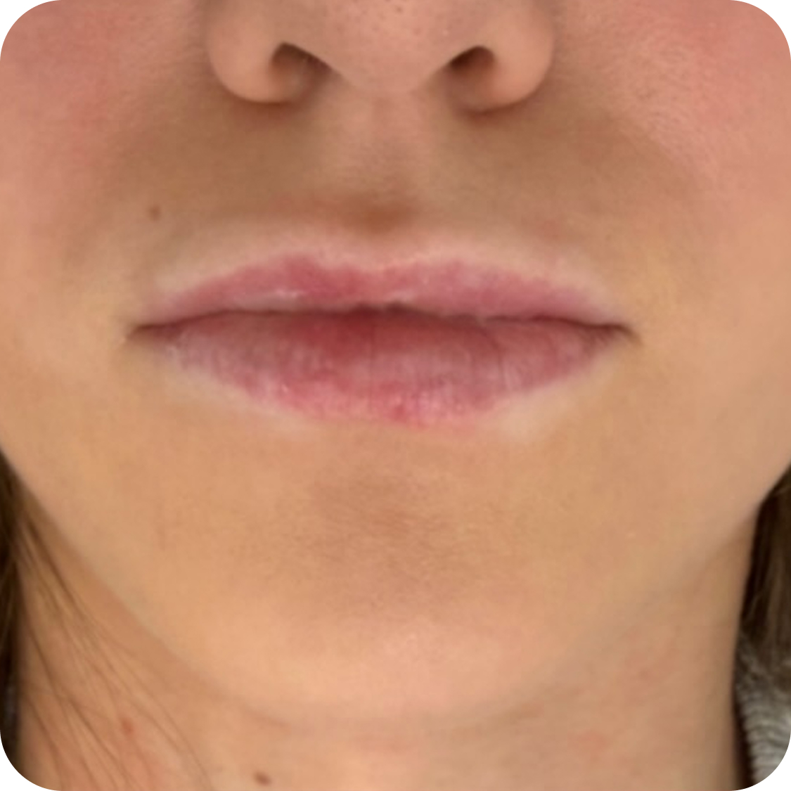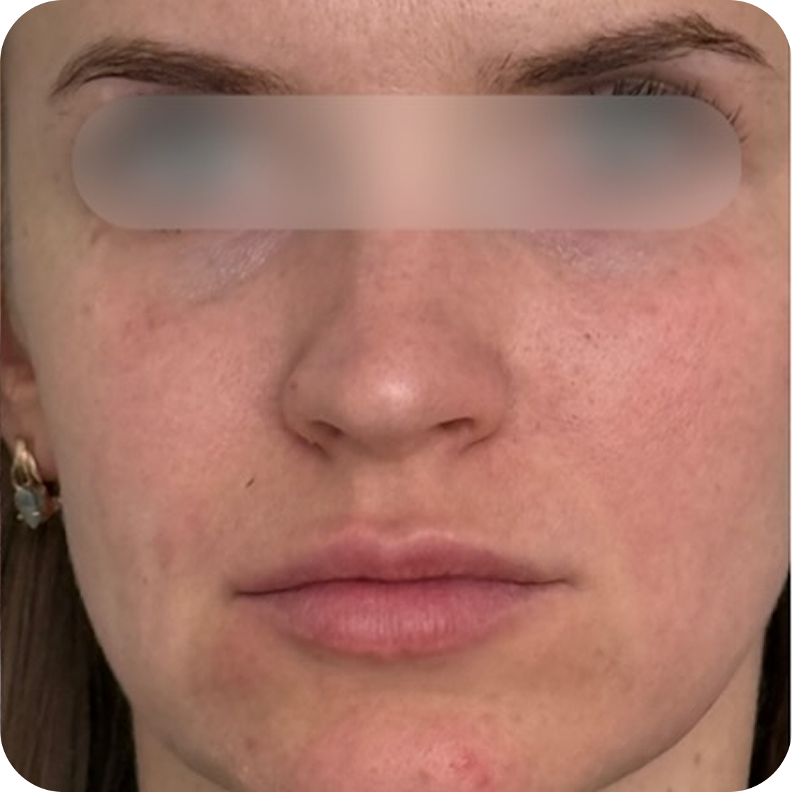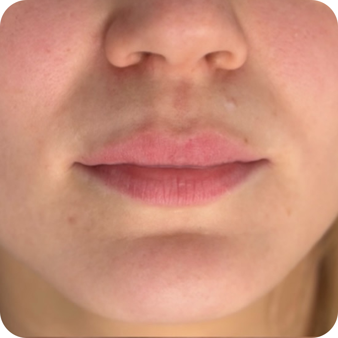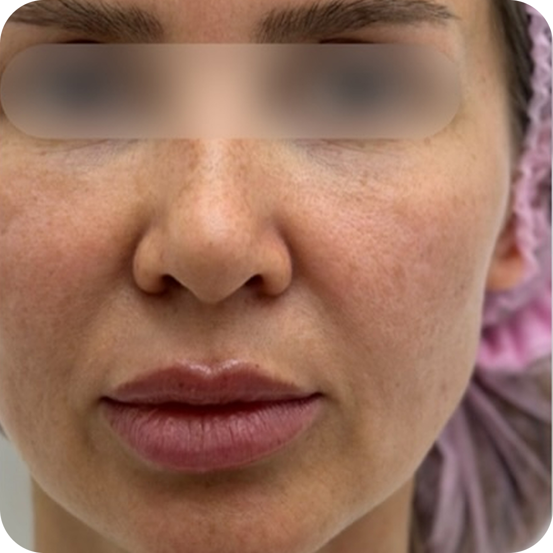 Поверхность губ выровнена, они стали более мягкими и наполненными, контур обозначен чётче, складки сглажены. Губы выглядят аккуратно, свежо и естественно, без эффекта чрезмерной коррекции.