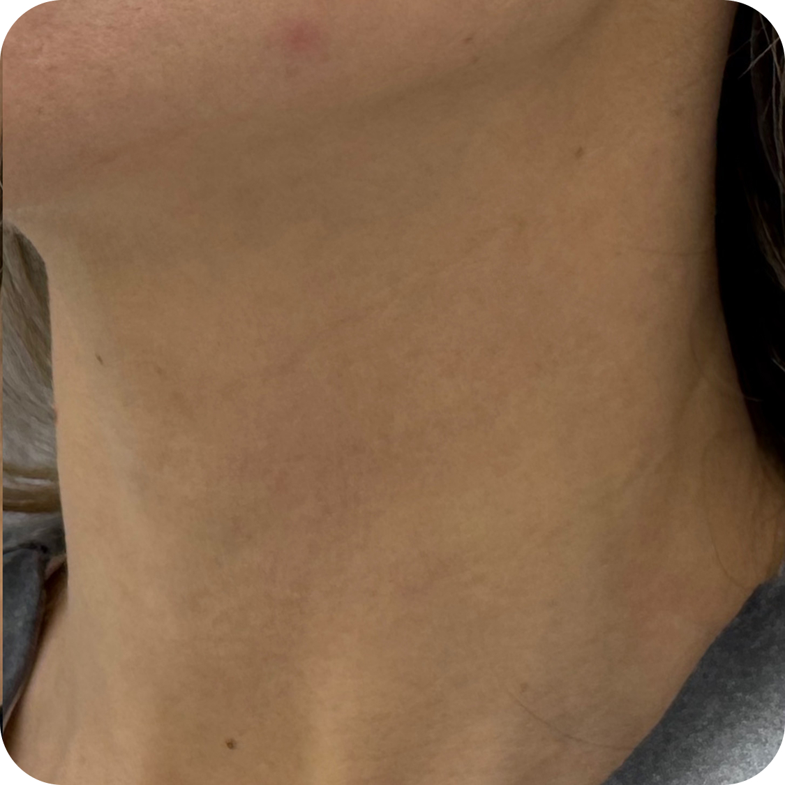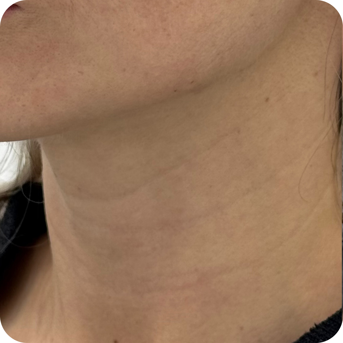 Кожа становится более гладкой и увлажнённой, заломы заметно разглаживаются, повышается плотность и эластичность, а шея выглядит более молодой и ухоженной. Результат выглядит естественно и сохраняется за счёт восстановления объёма и улучшения качества кожи.