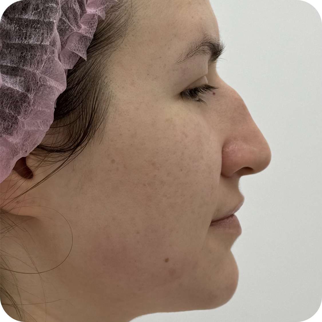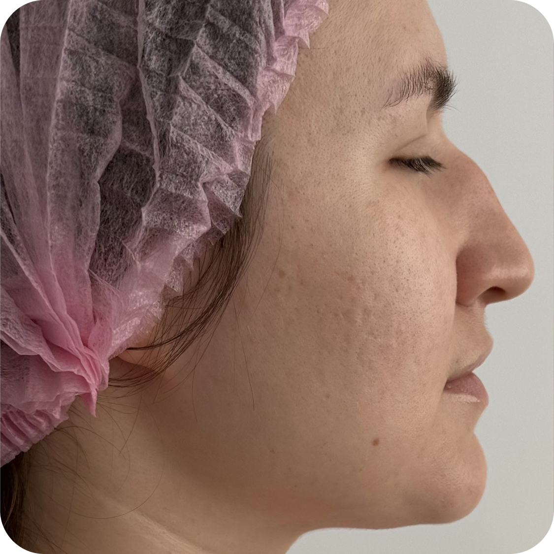 Кожа стала более уплотнённой и подтянутой, рельеф выровнен, морщины сглажены, контуры лица выглядят более чёткими. Внешний вид стал более свежим и омоложённым за счёт глубокой стимуляции коллагена и обновления тканей.